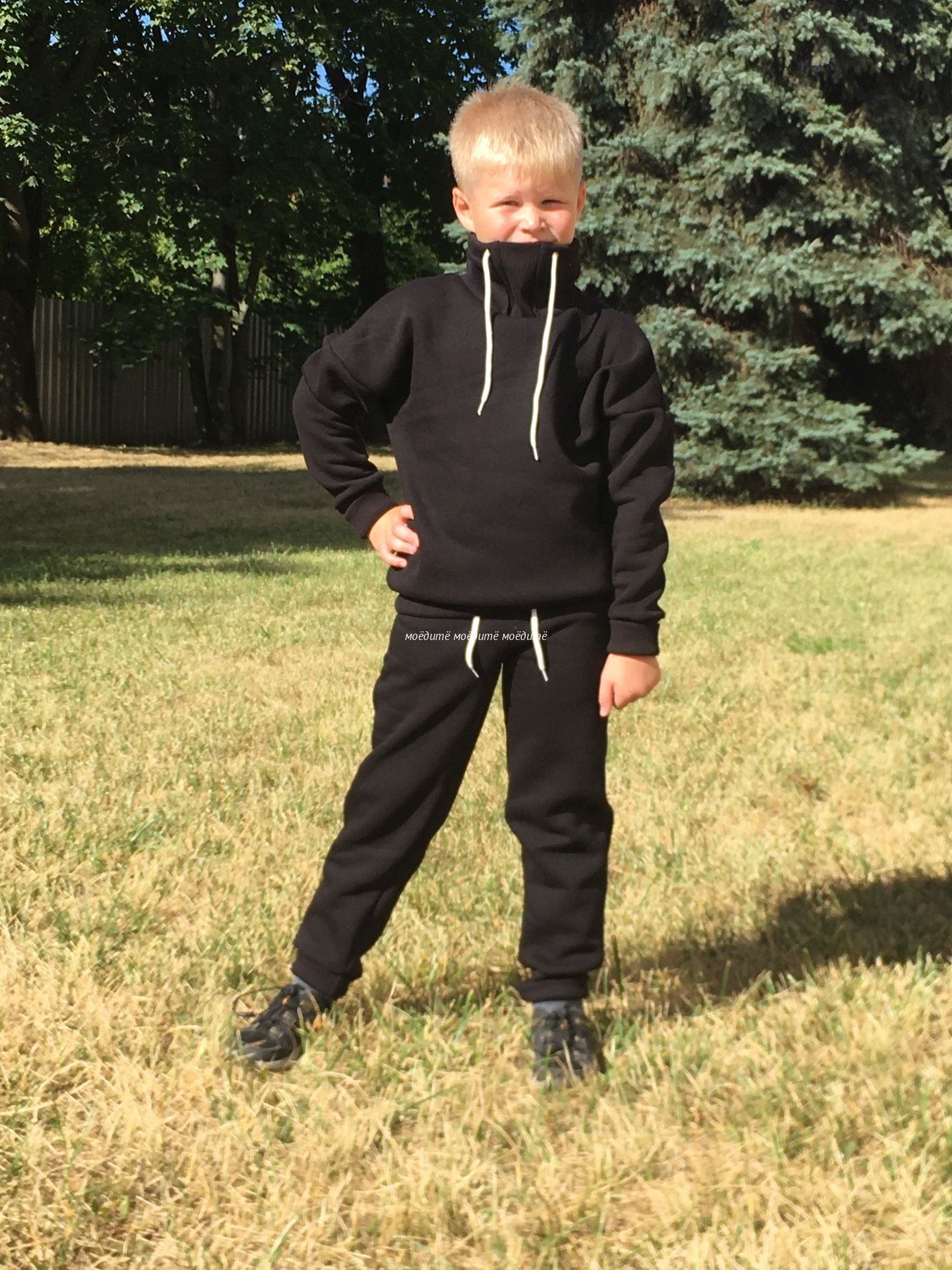Костюм выполнен из футера 3-хнитки с начёсом. Состоит из свитшота и брюк. Брюки сверху на широкой резинке и со шнурком, снизу на манжете с отворотом. Свитшот с воротником-стойкой, украшен шнурком, снизу вставлена резинка, рукава на манжетах с отворотом.