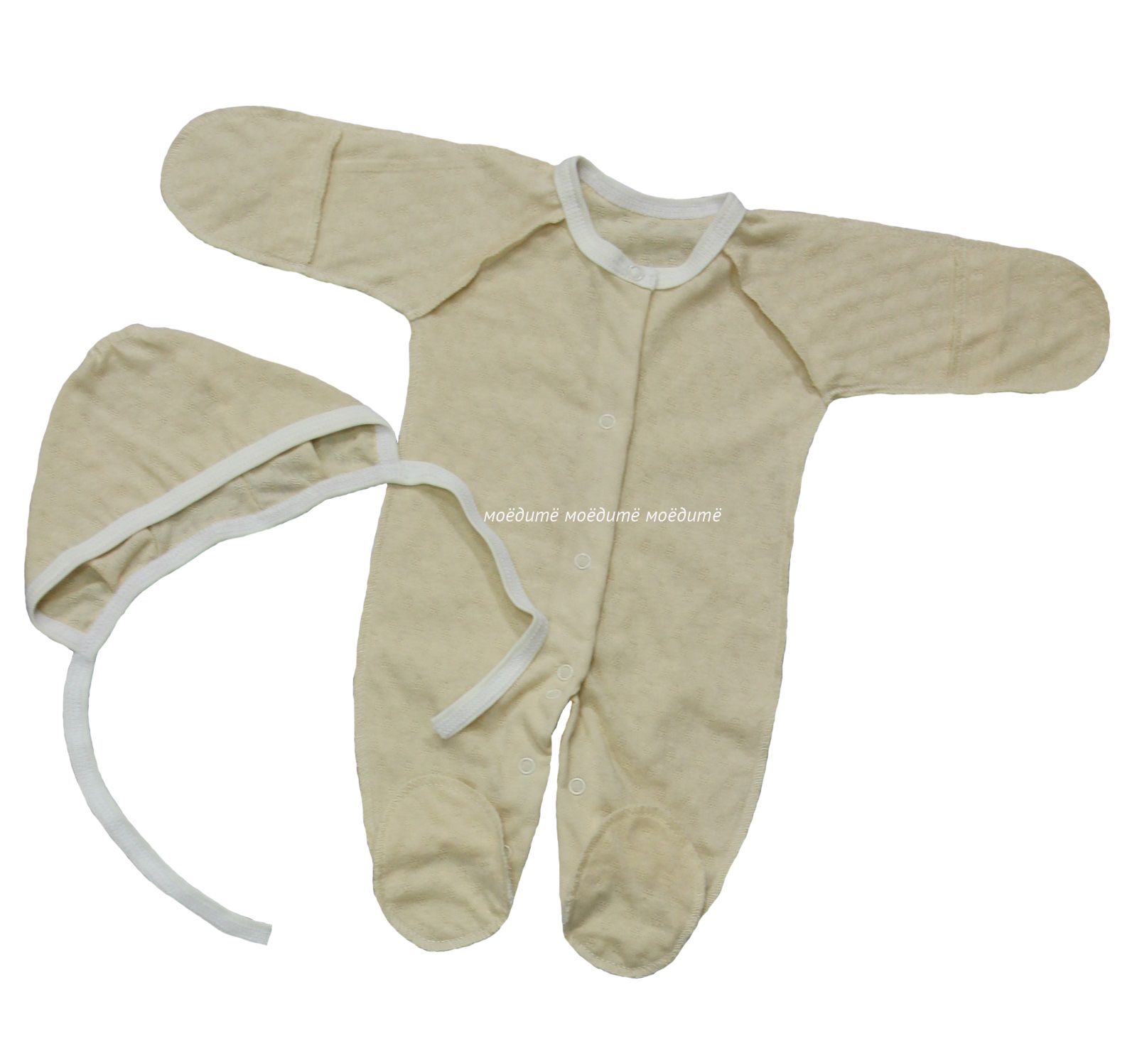 В комплект входит: удобный комбинезончик на кнопочках спереди и между ножек, чепчик на завязках.